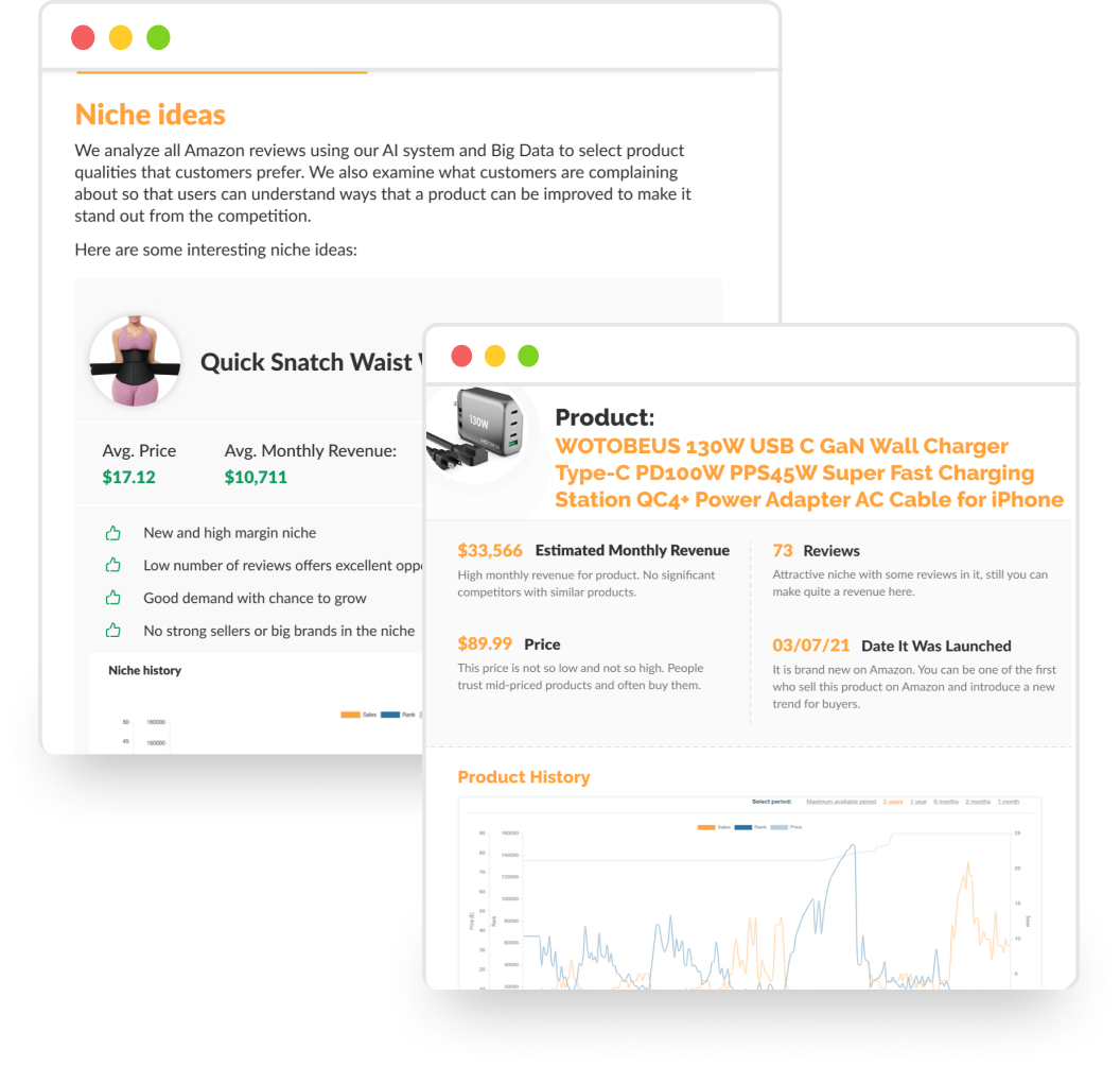 (only available with annual offer) Receive weekly reports that includes 19 of the fastest growing products with low competition during the year, that are perfect to start selling, plus 12 monthly reports with Amazon news and tips for maximizing sales.