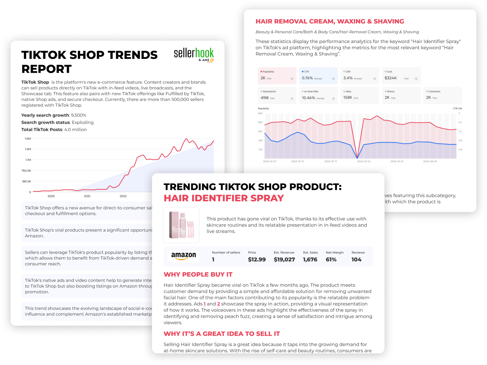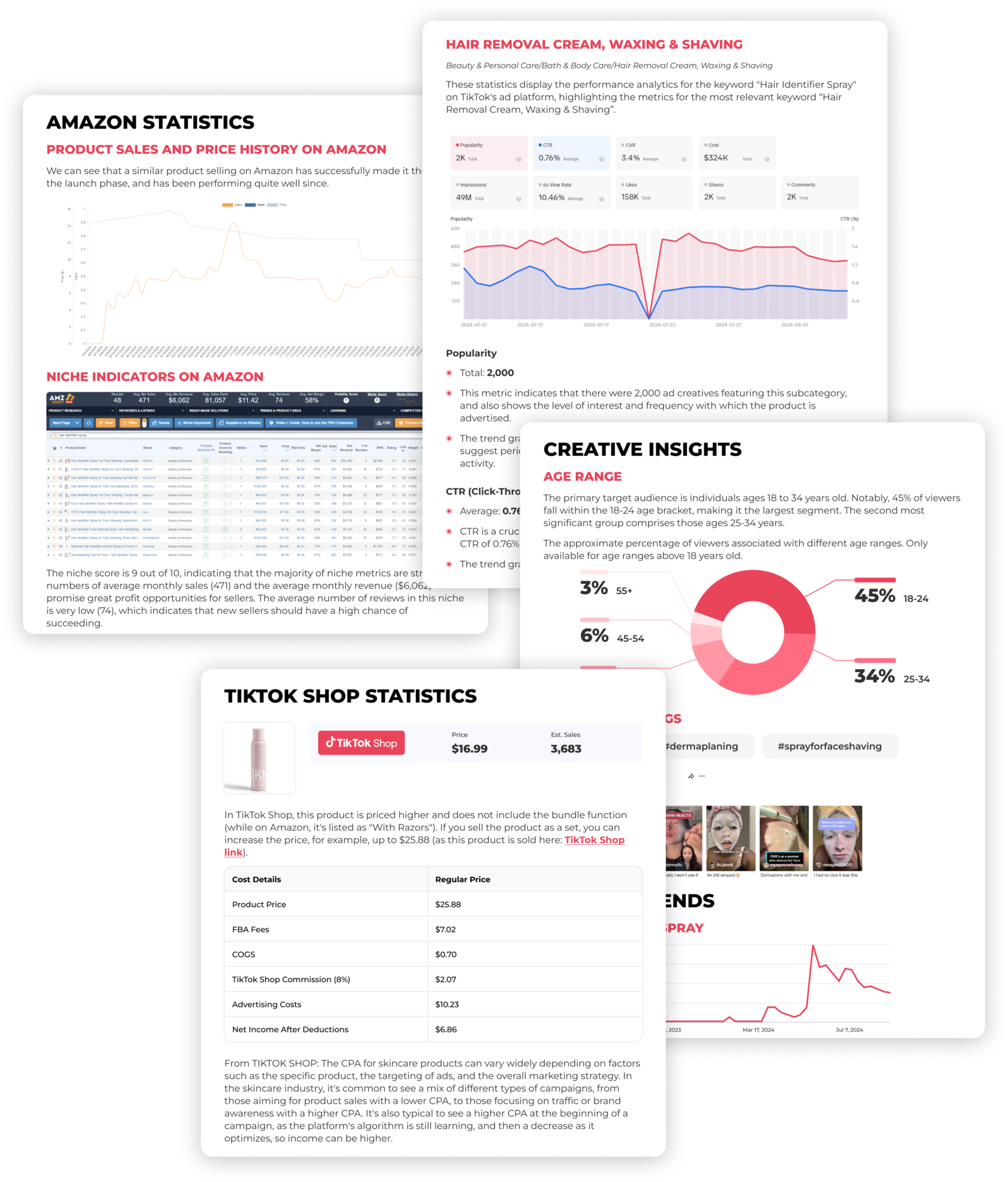 Key metrics from both platforms, such as product price points, sales volumes, ad performance, and audience demographics, to help you gauge market opportunities